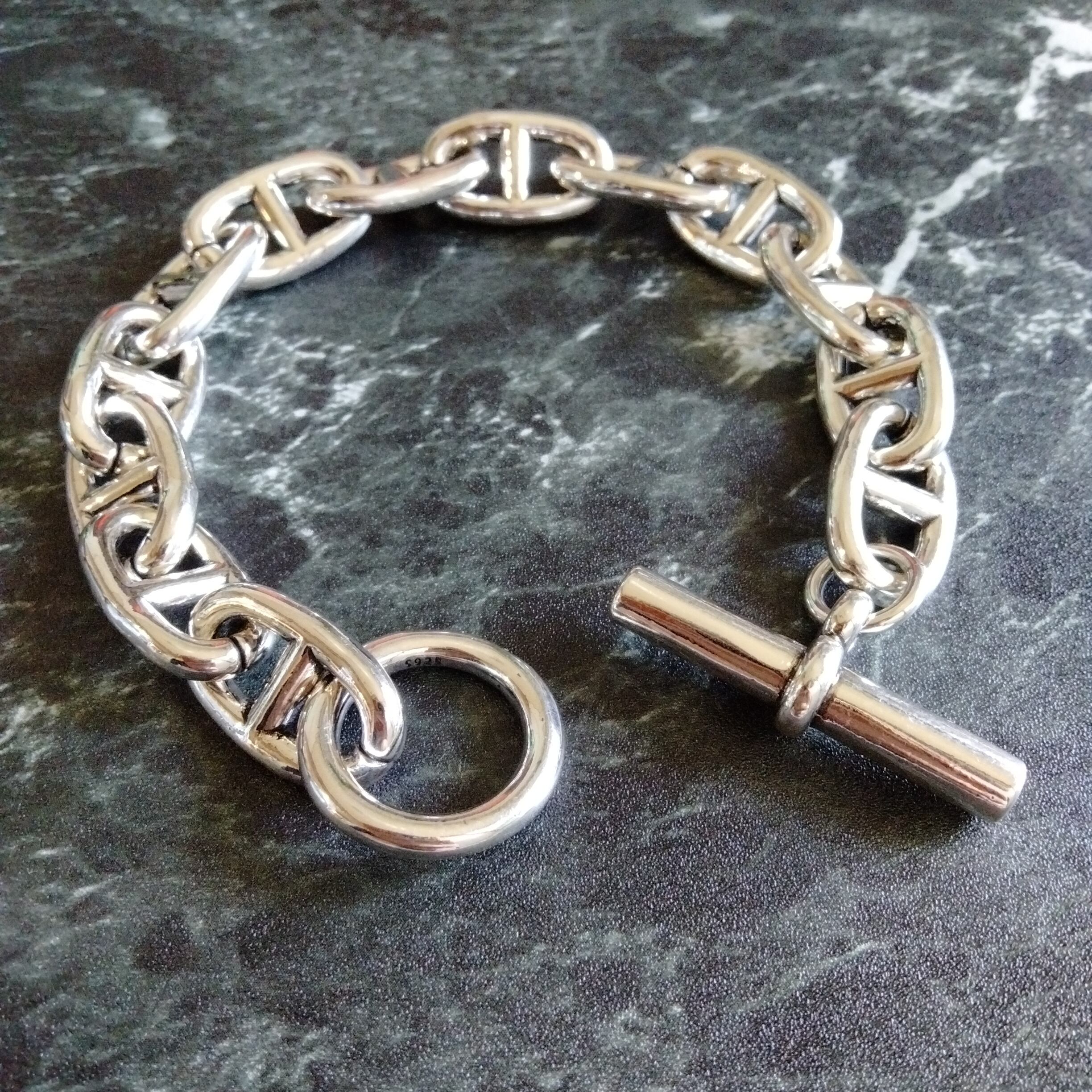 シルバー925製のリンクチェーンブレスレット、トグル式留め具付きで調整可能。