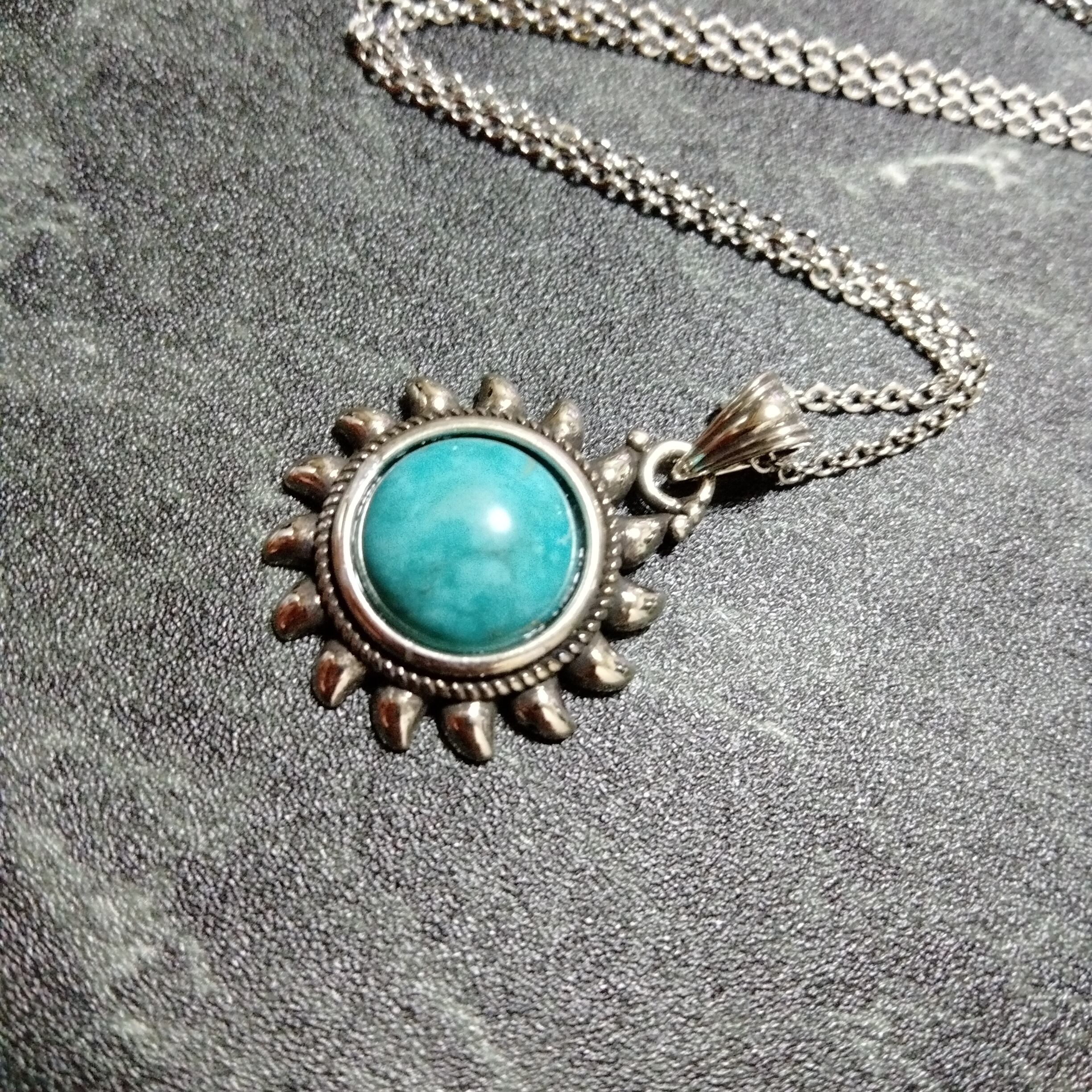 ターコイズのサンバーストデザインペンダントネックレス、シルバー925製、調整可能チェーン付き。