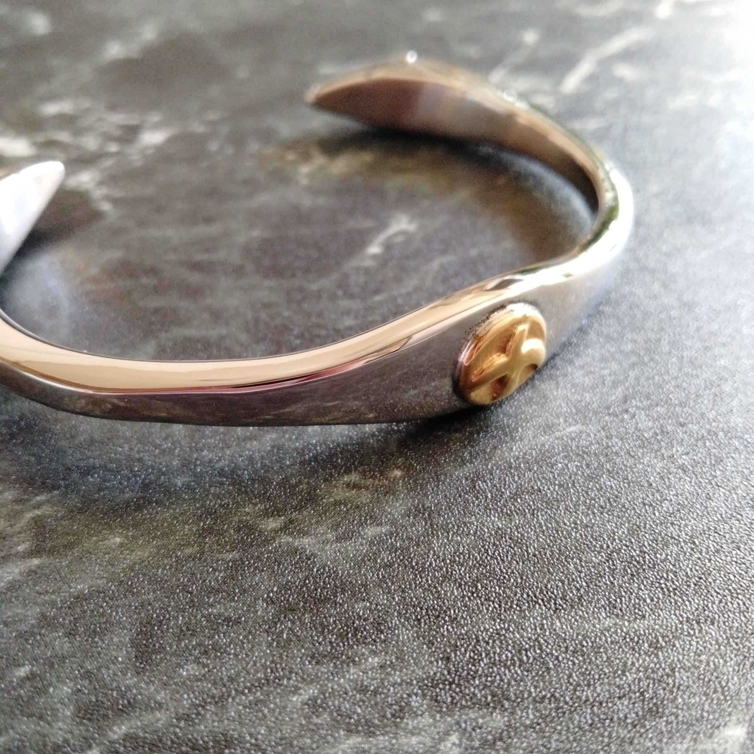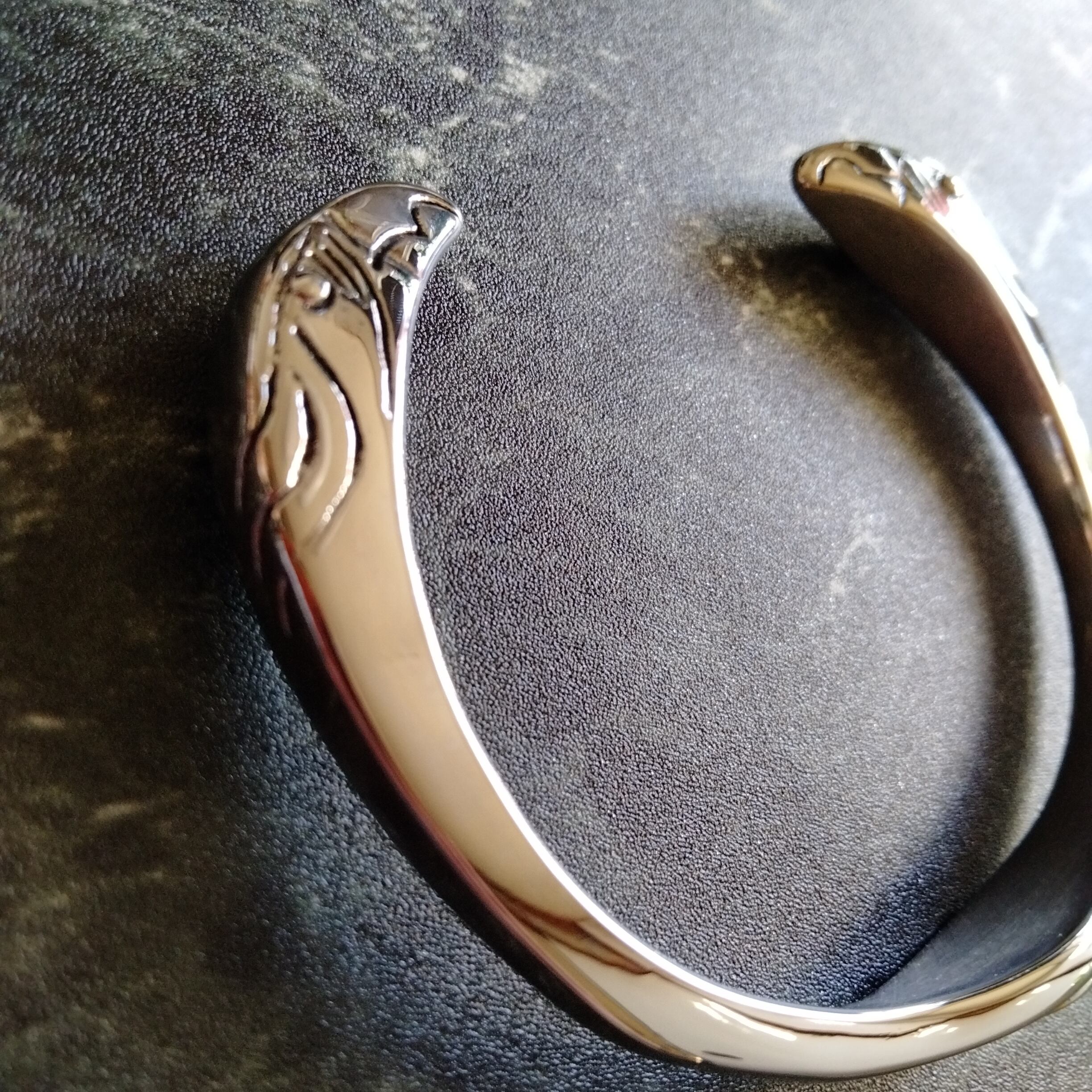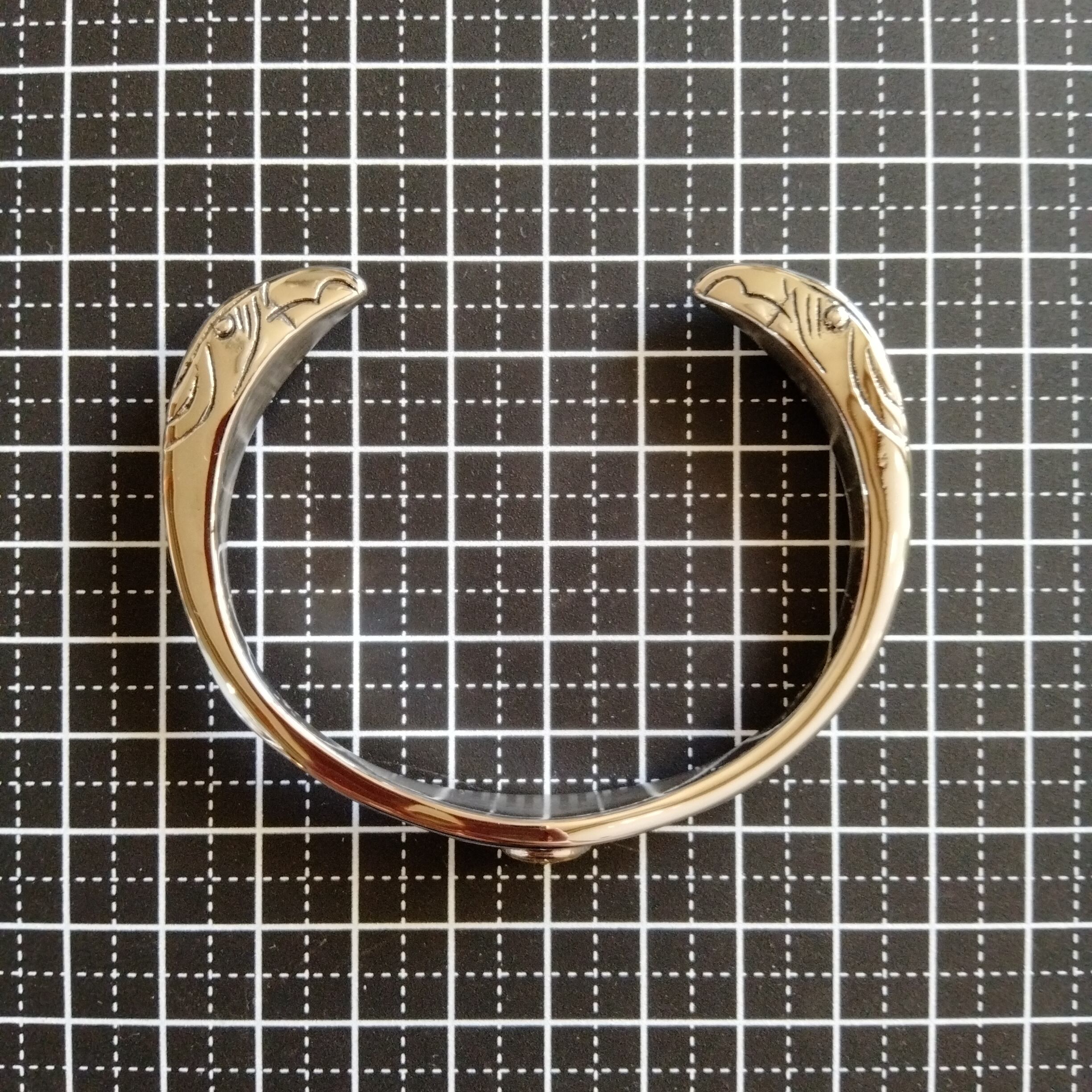 両サイドに鳥/鷹/鷲の頭部を模したデザインの、サージカルステンレススチール製オープンバングル、金色の彫刻された鳥と太陽の装飾ボタン付き。