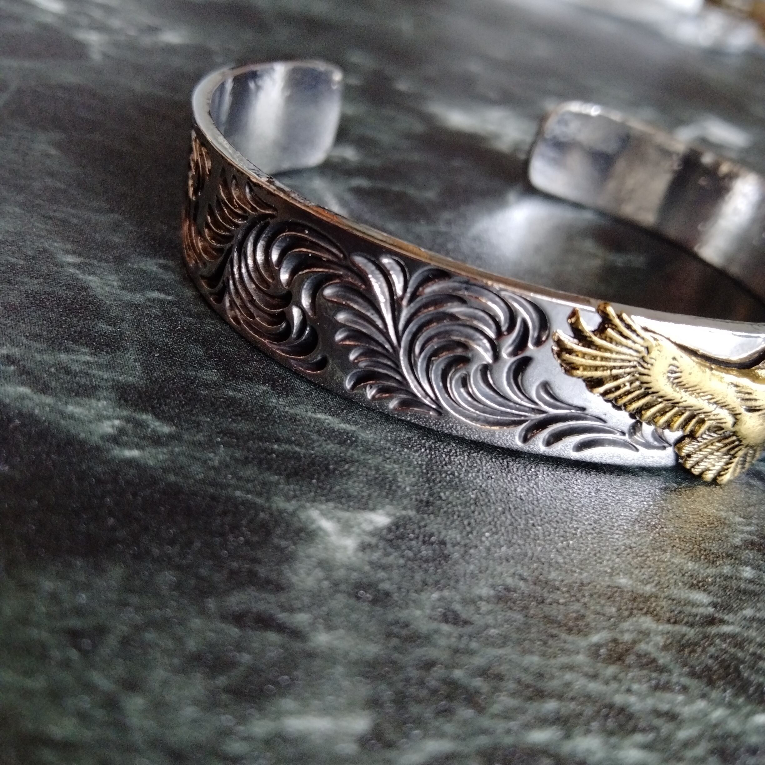 波模様と鷲の彫刻が施されたシルバーとゴールドのカフバングル。