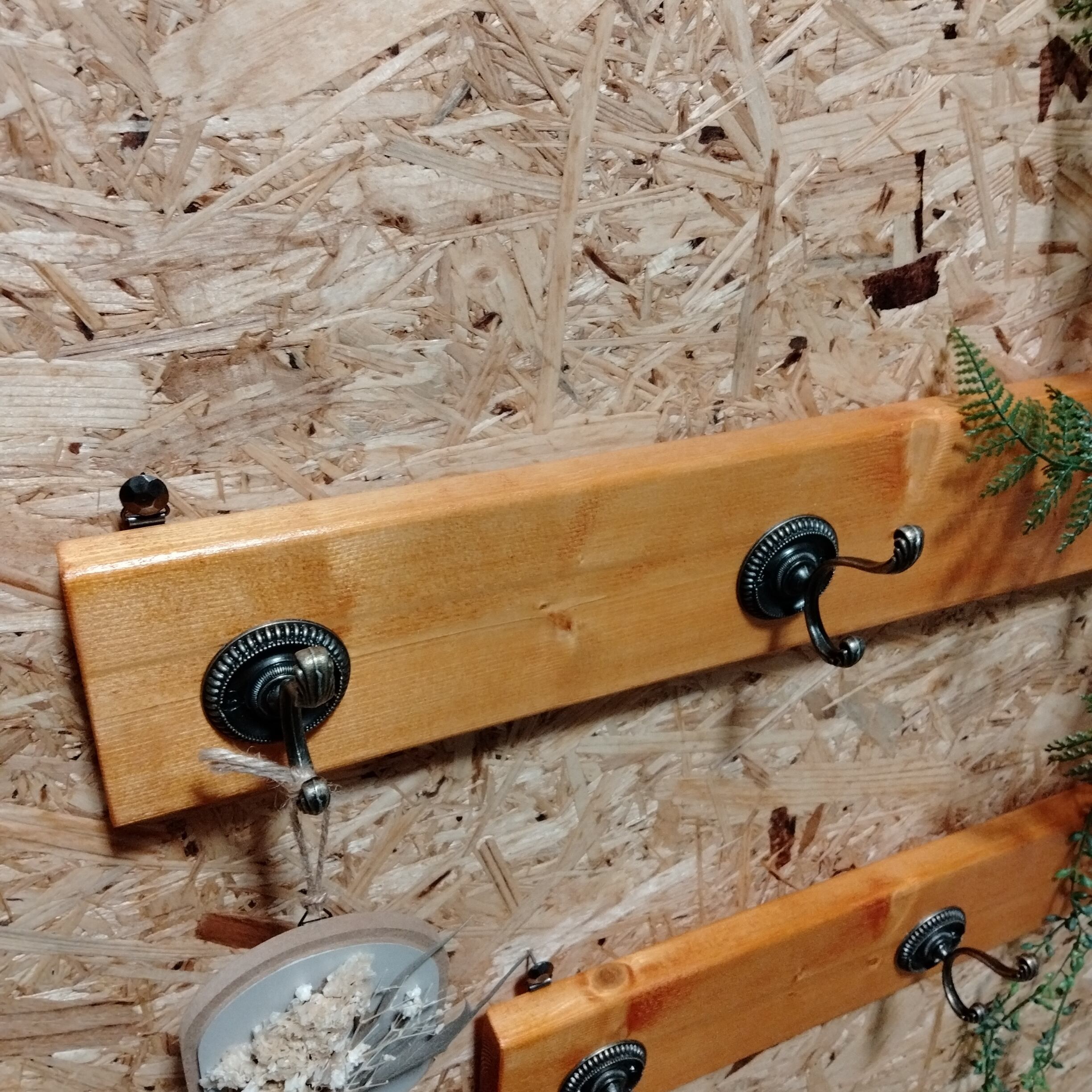 メープルカラーのシンプルな壁掛けラック、アンティーク柄のフック付きで収納力抜群。