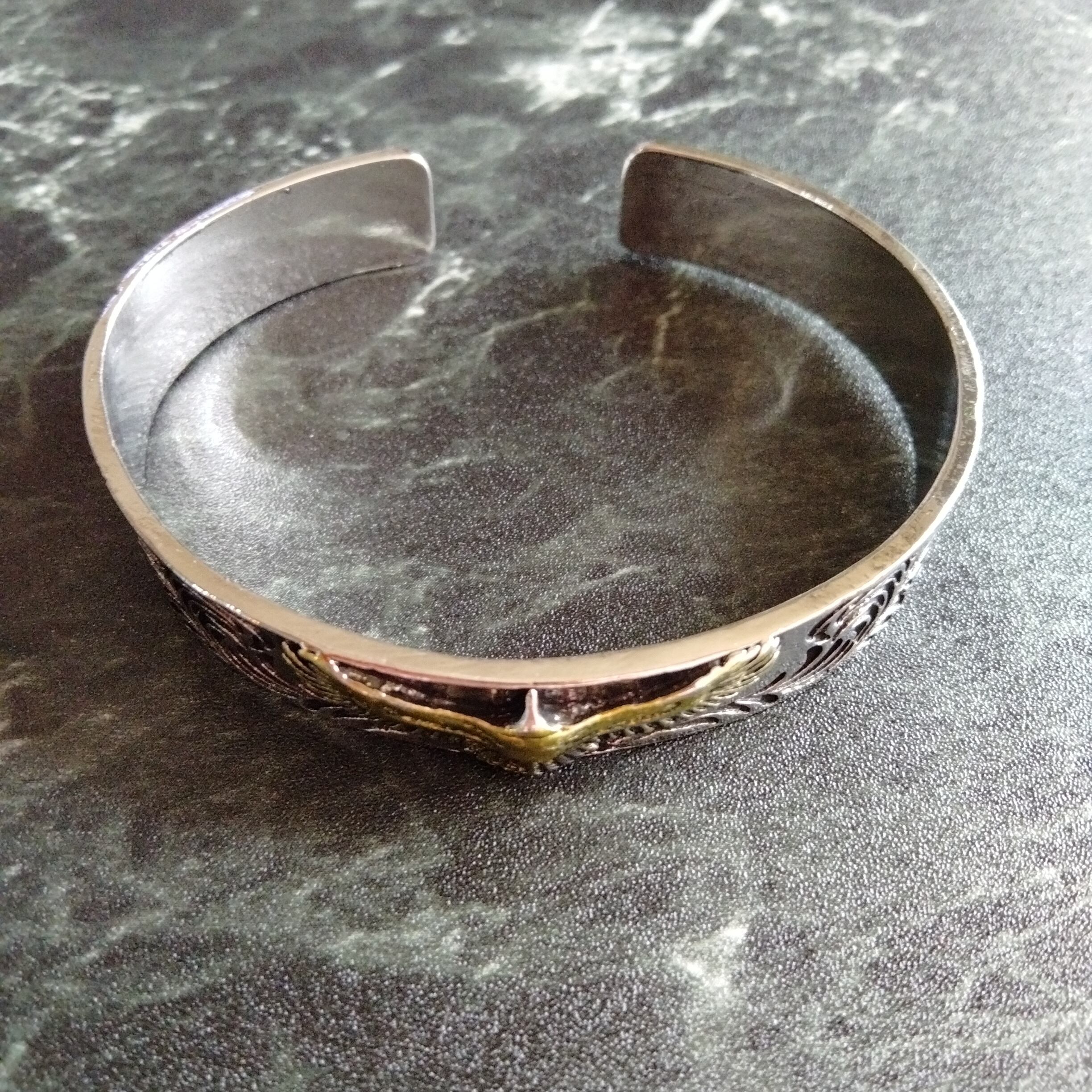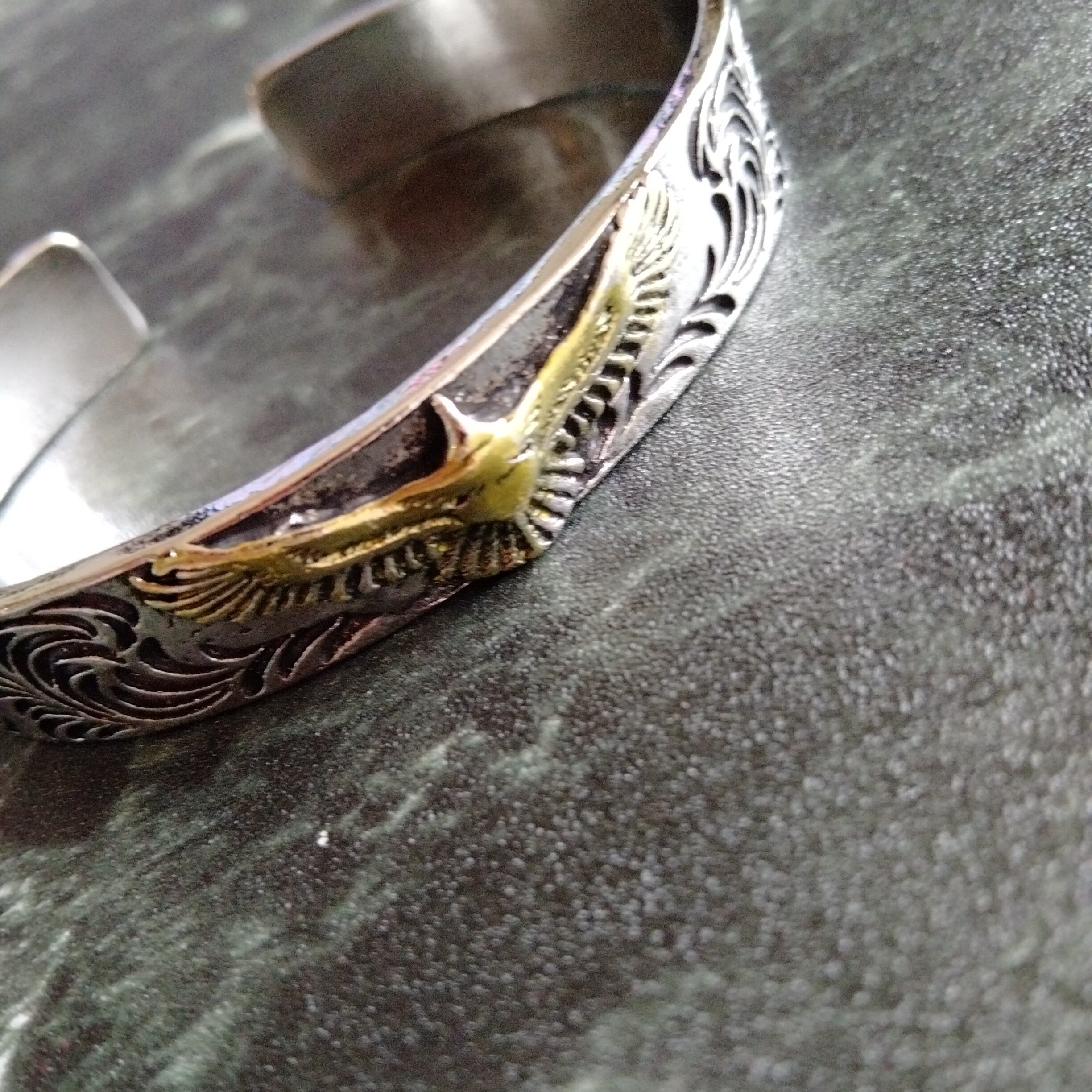 波模様と鷲の彫刻が施されたシルバーとゴールドのカフバングル。