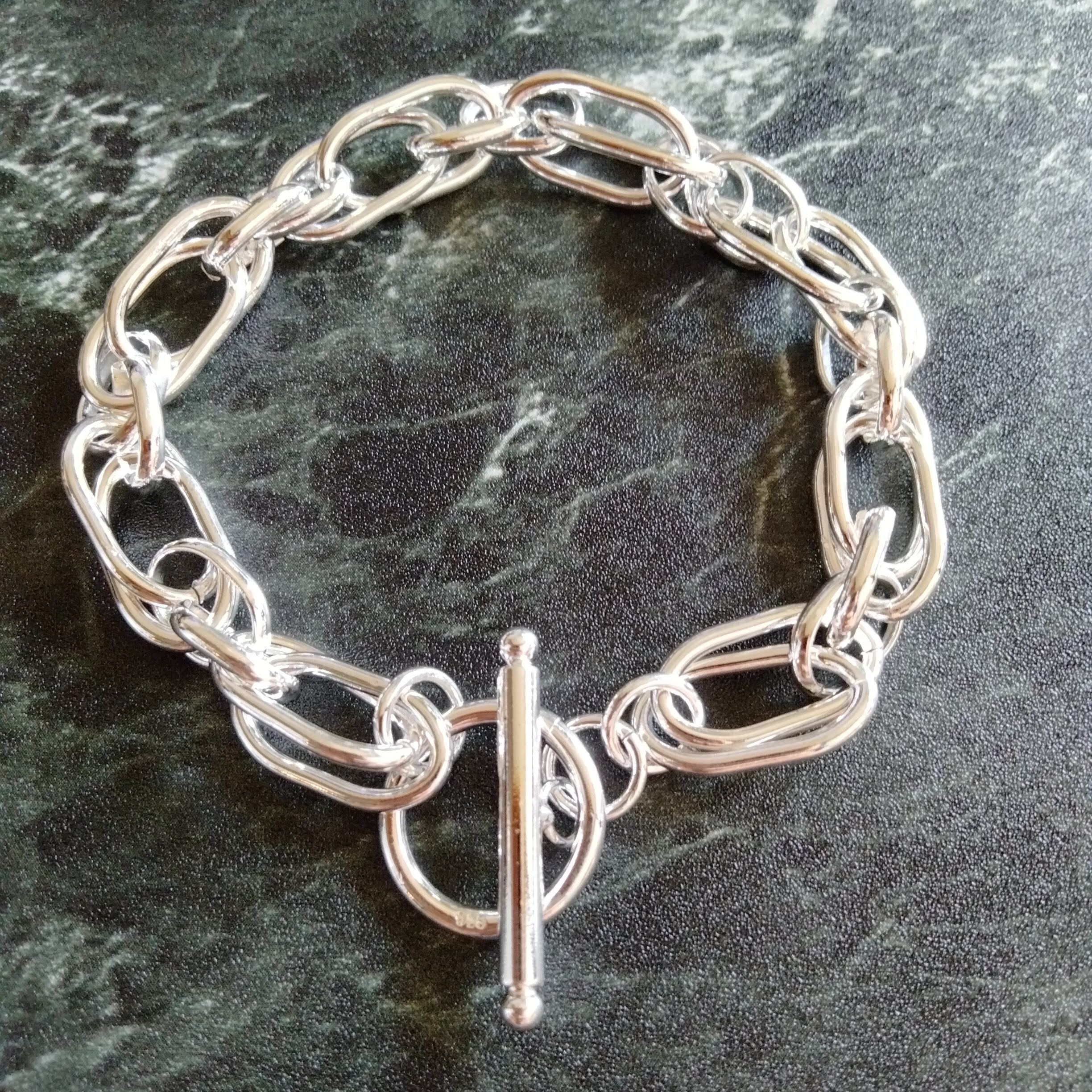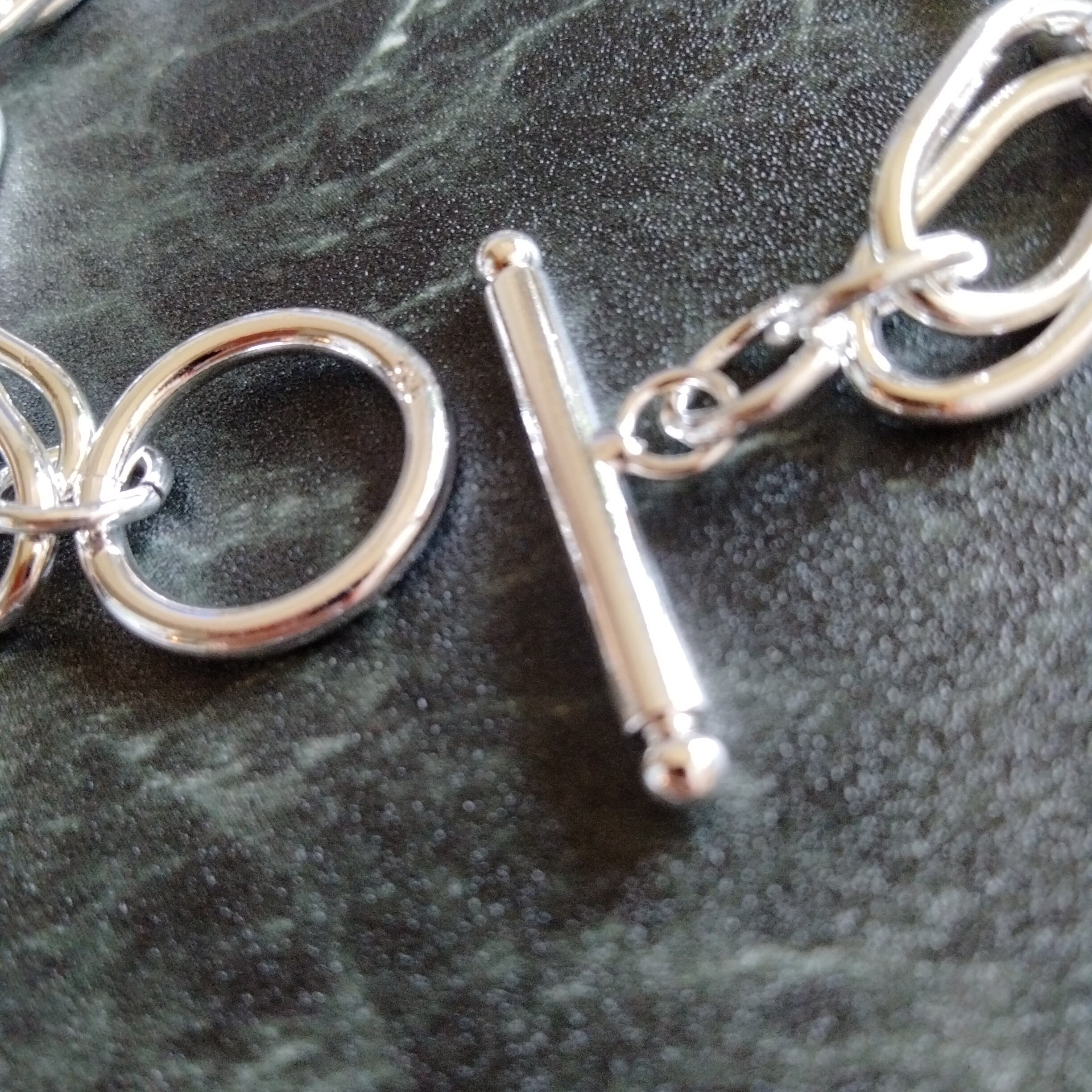 シルバーのリンクチェーンブレスレット、トグル式留め具付き。