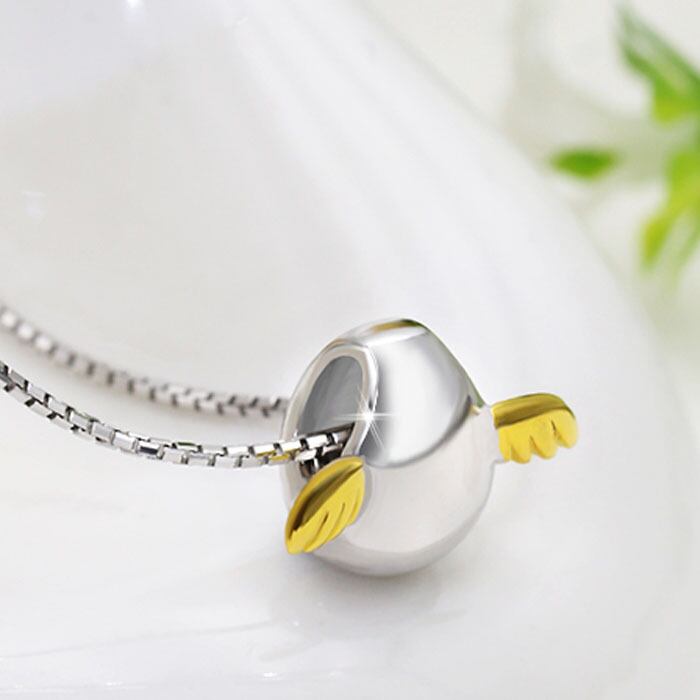 シルバーとゴールドの鳥型ペンダント、コンパクトで可愛らしいデザイン。